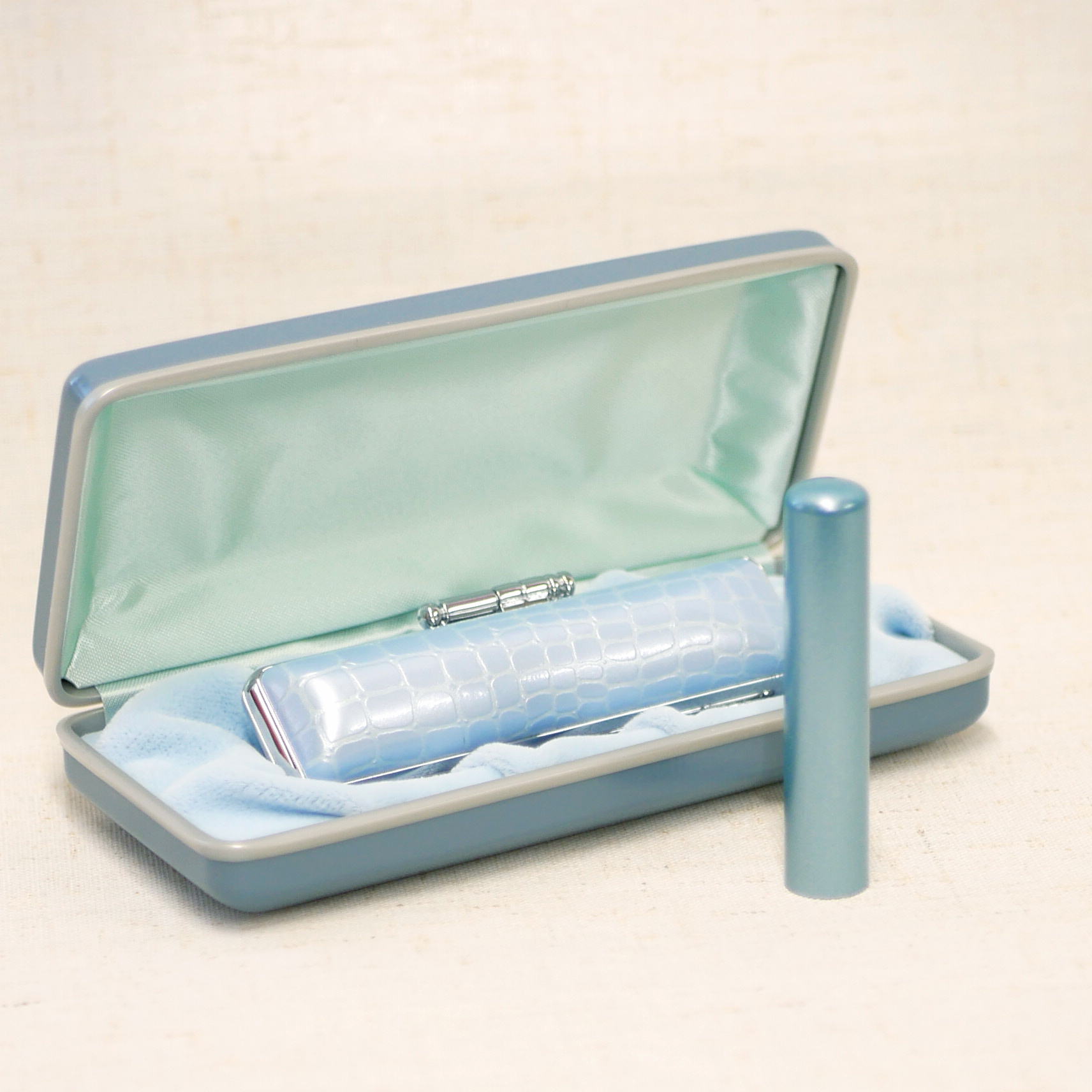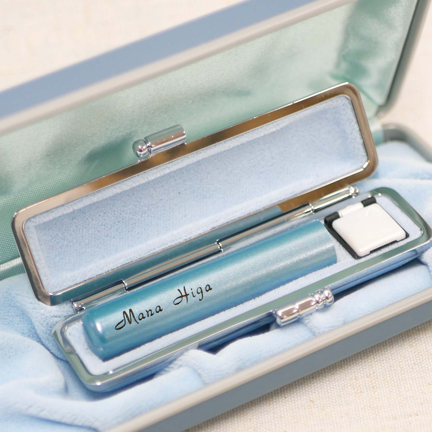 赤ちゃんはんこ"パール”ブルーケースセット印材ベビーブルー(名前または姓の彫刻)